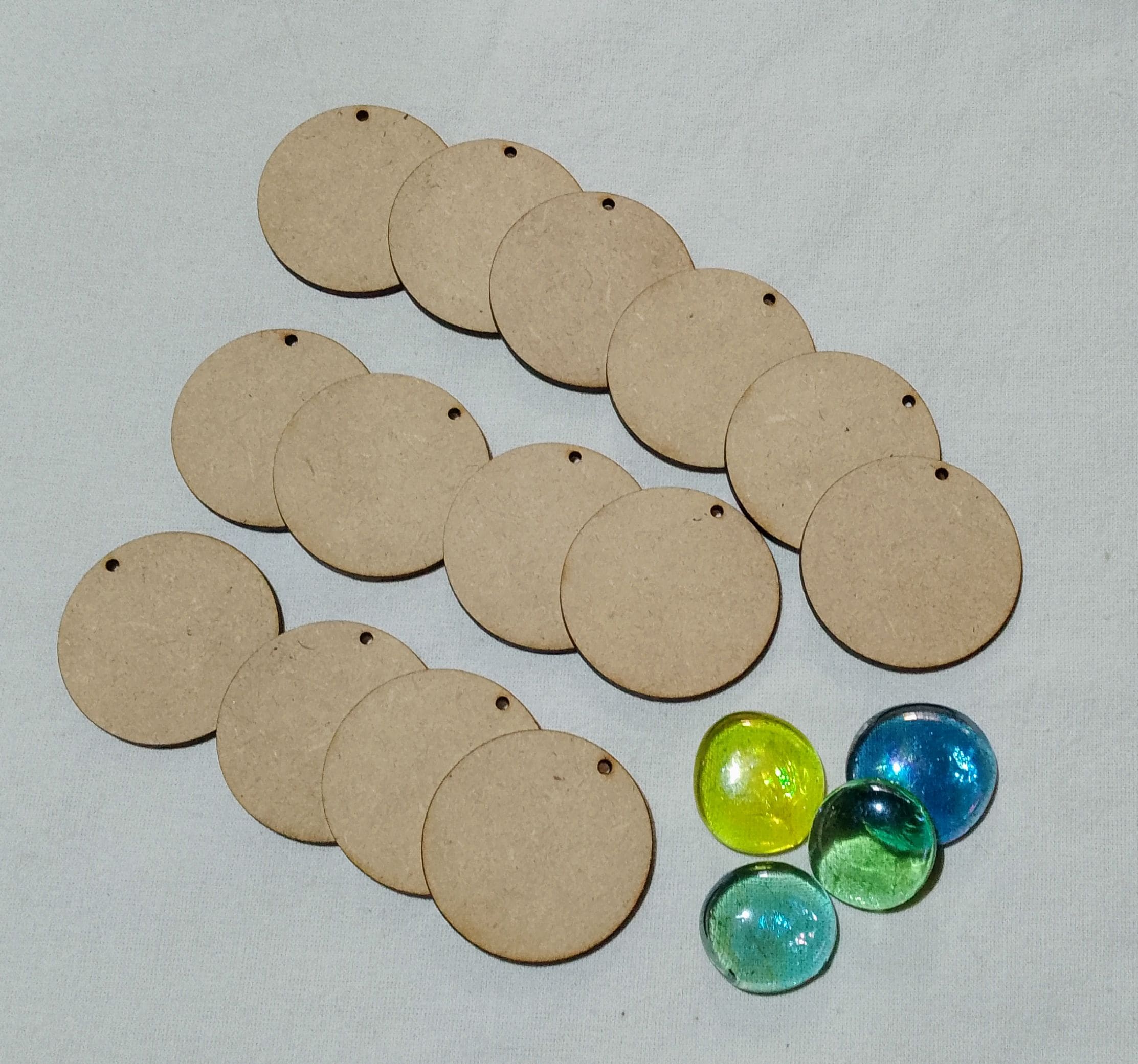 Círculos de 7 cm con 1 orificio en MDF (fibrofácil) de 3 mm de espesor, color natural sin pintar.